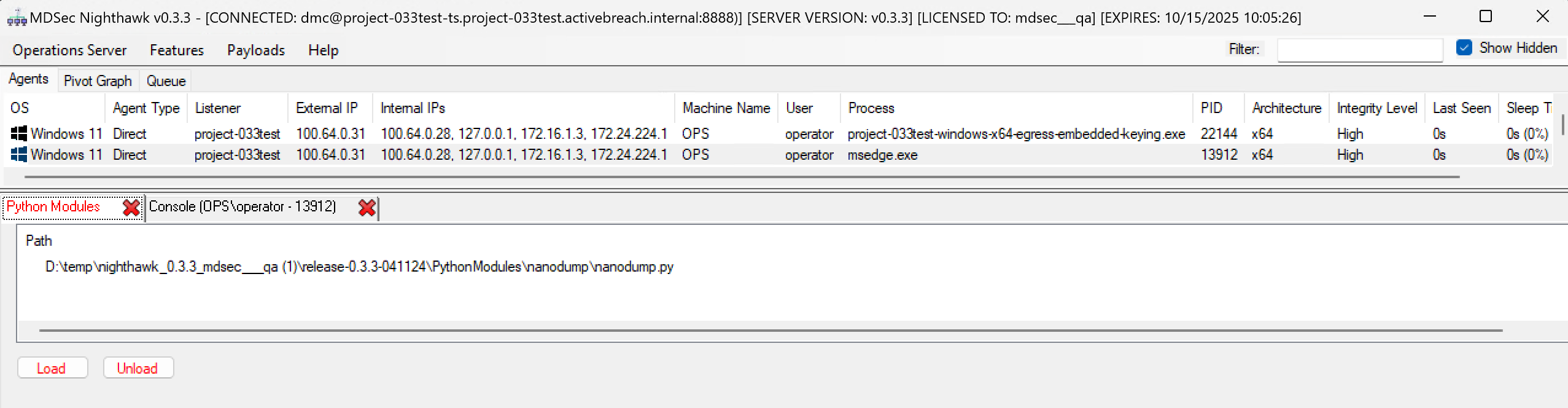 The scripts can then be imported to Nighthawk using the Python Modules feature. We’ve provided a thorough example using Fortra’s Nanodump: