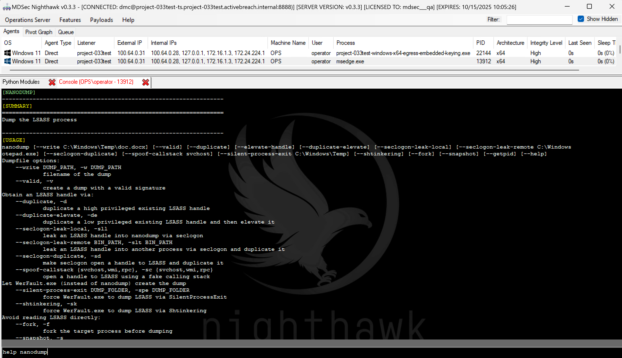 When the script is imported, it then introduces the nanodump command to Nighthawk: