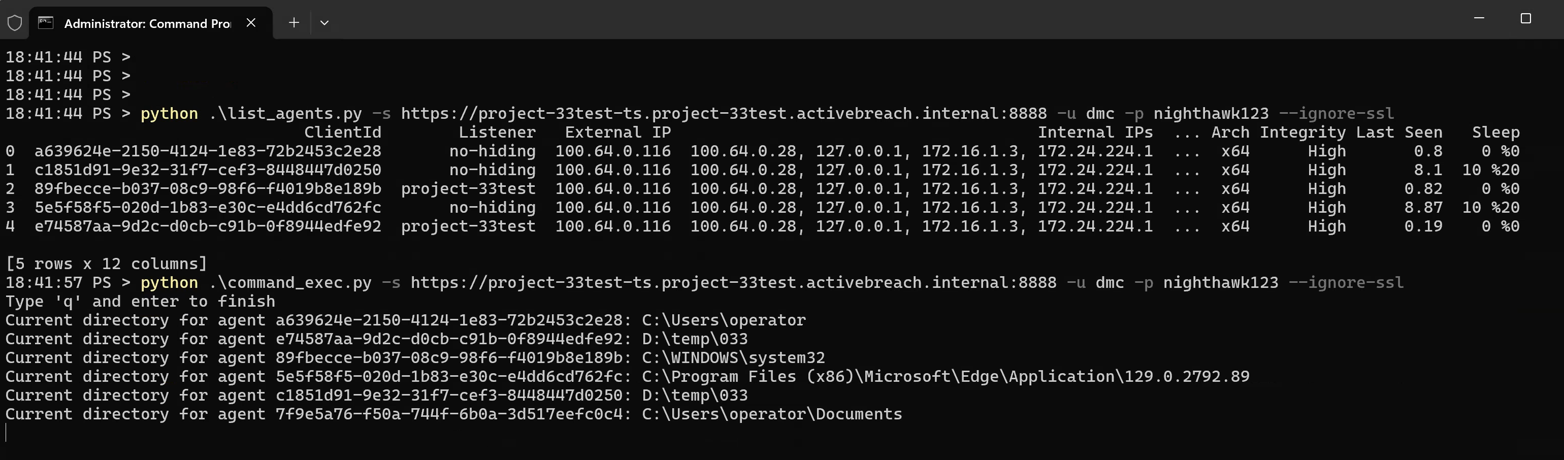 In the example below, we see two scripts; the first which lists all the agents currently connected, and the second which simply just runs the pwd command on all agents: