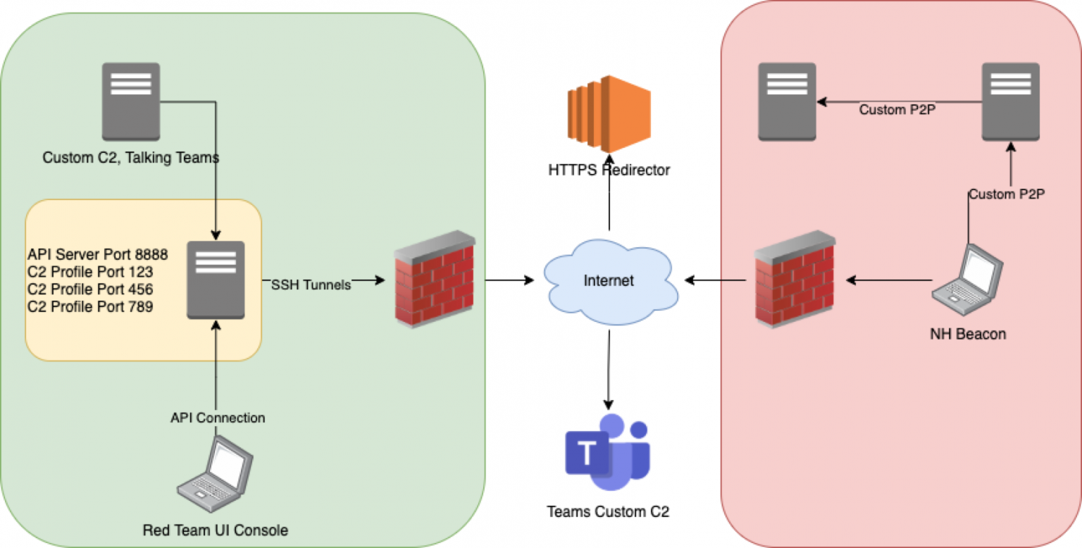 A typical red team infrastructure deployment for an operation using Nighthawk might look as follows, where the yellow zone contains the API management server (which the operators interact with through the UI) and n number of C2 servers which can be deployed to support multiple profile configurations: