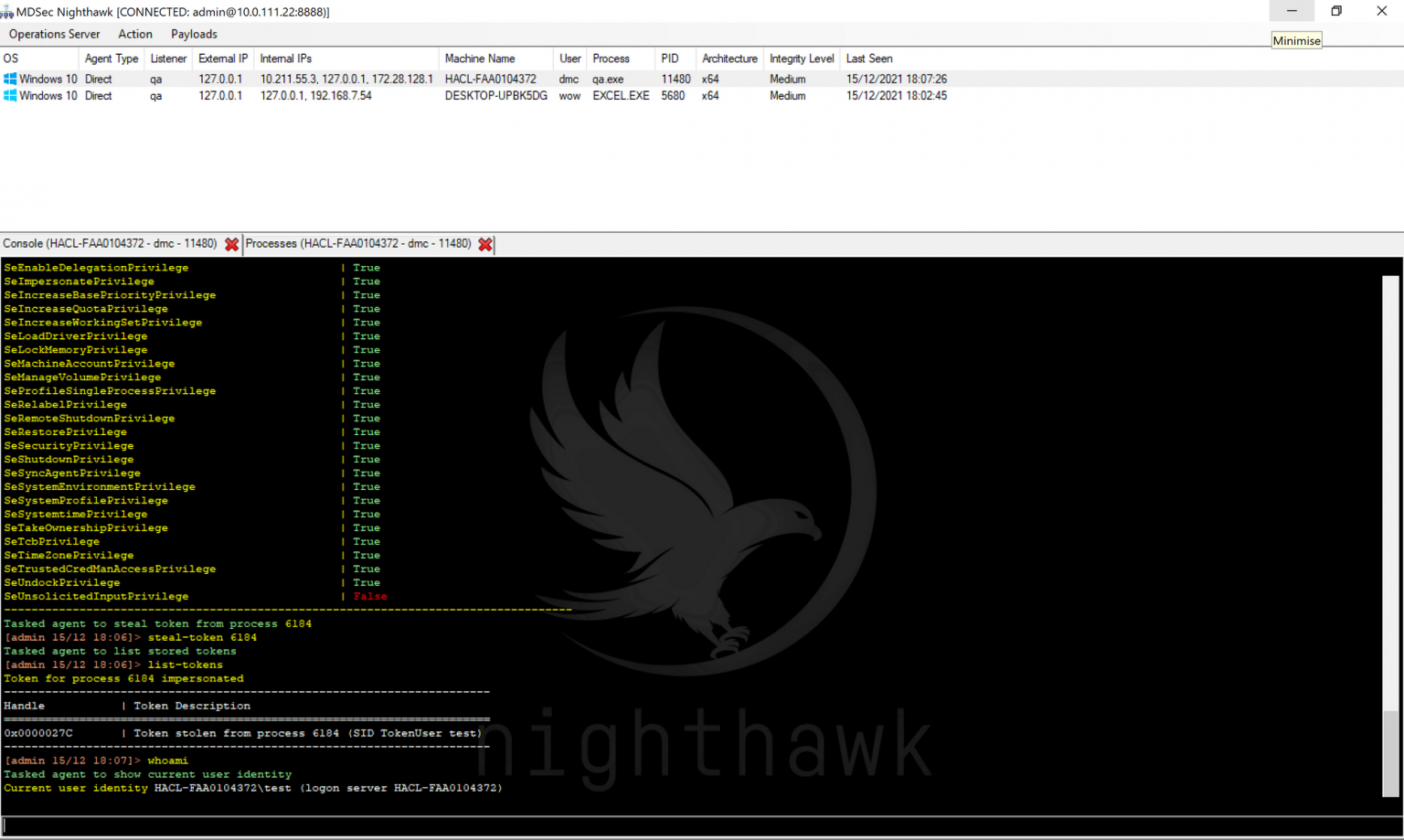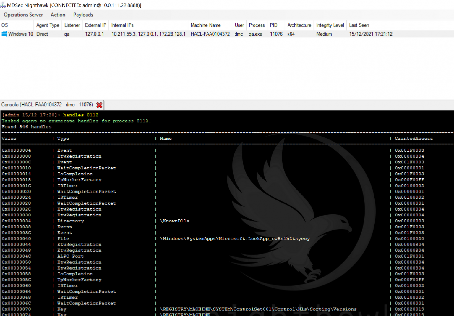 The ability to triage the host and other running process is important for an operator when making decisions on their tradecraft. To assist with this, Nighthawk provides a number of built-in Windows API driven commands, including: