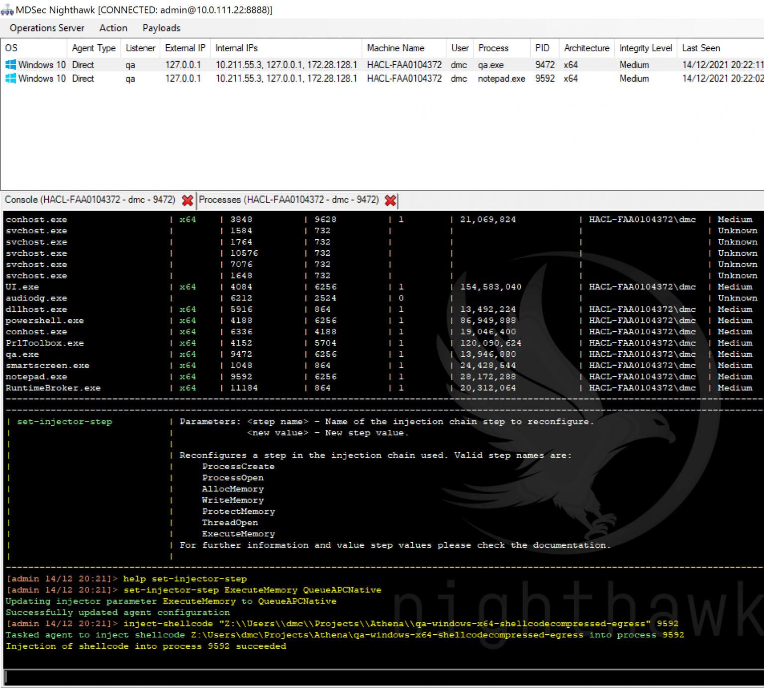 Nighthawk is predominantly designed to operate in-process and to maintain a minimal footprint on the endpoint. There are of course circumstances where you may want to perform injection, typically this may include situations such as deploying a backup beacon, gaining access to an alternate desktop session or wanting to blend your tradecraft in with a specific process. Nighthawk provides the spawn-rdll, spawn-shellcode, inject-rdll and inject-shellcode commands within the UI to perform these operations.