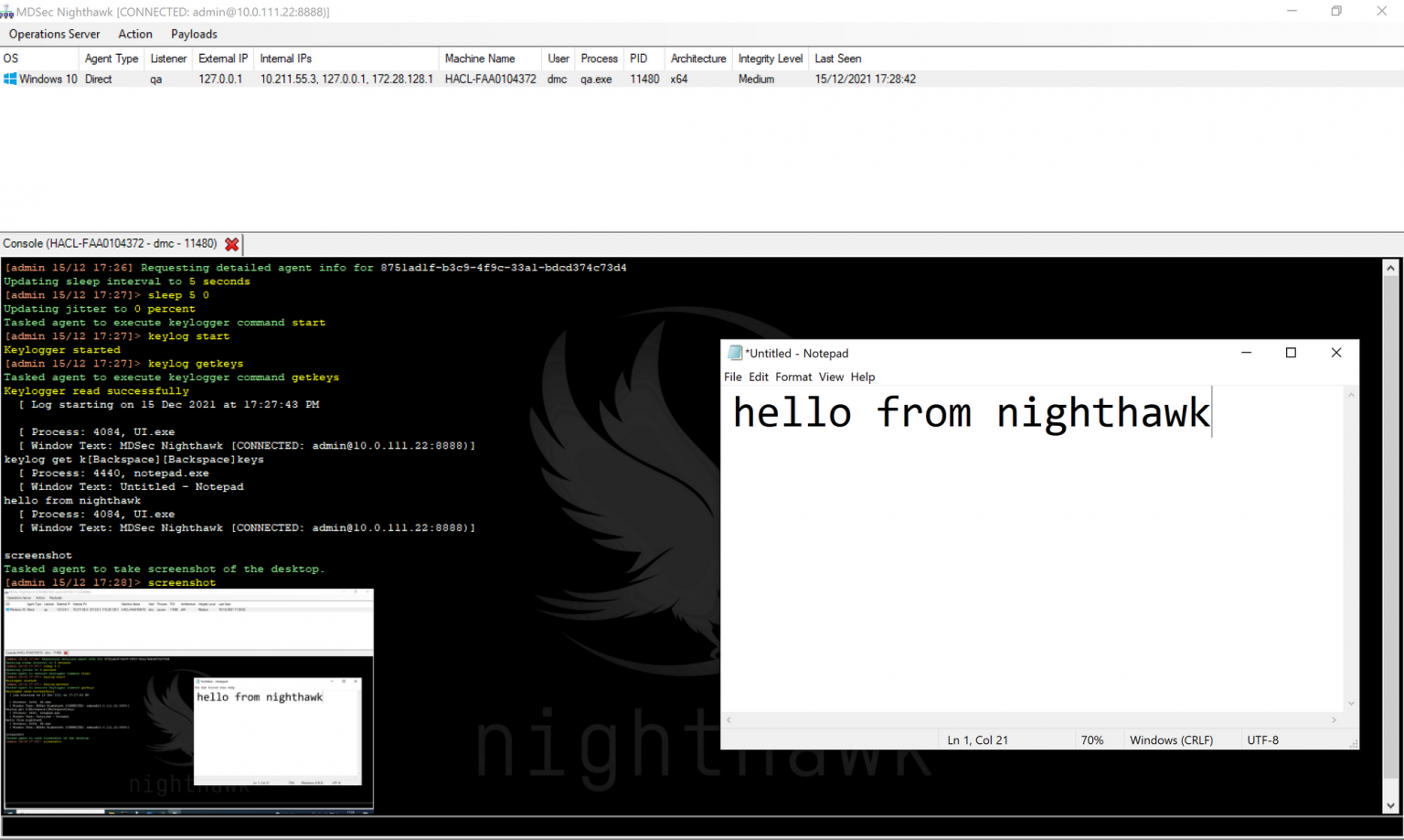 The ability to monitor a user is often pivotal to an operation when attempting to achieve objectives, in particular where intimate knowledge of business processes is required. Nighthawk provides operators with built-in screenshot and keylogging commands aligned to our OpSec principles, which allow the operator to closely monitor user behaviour:
