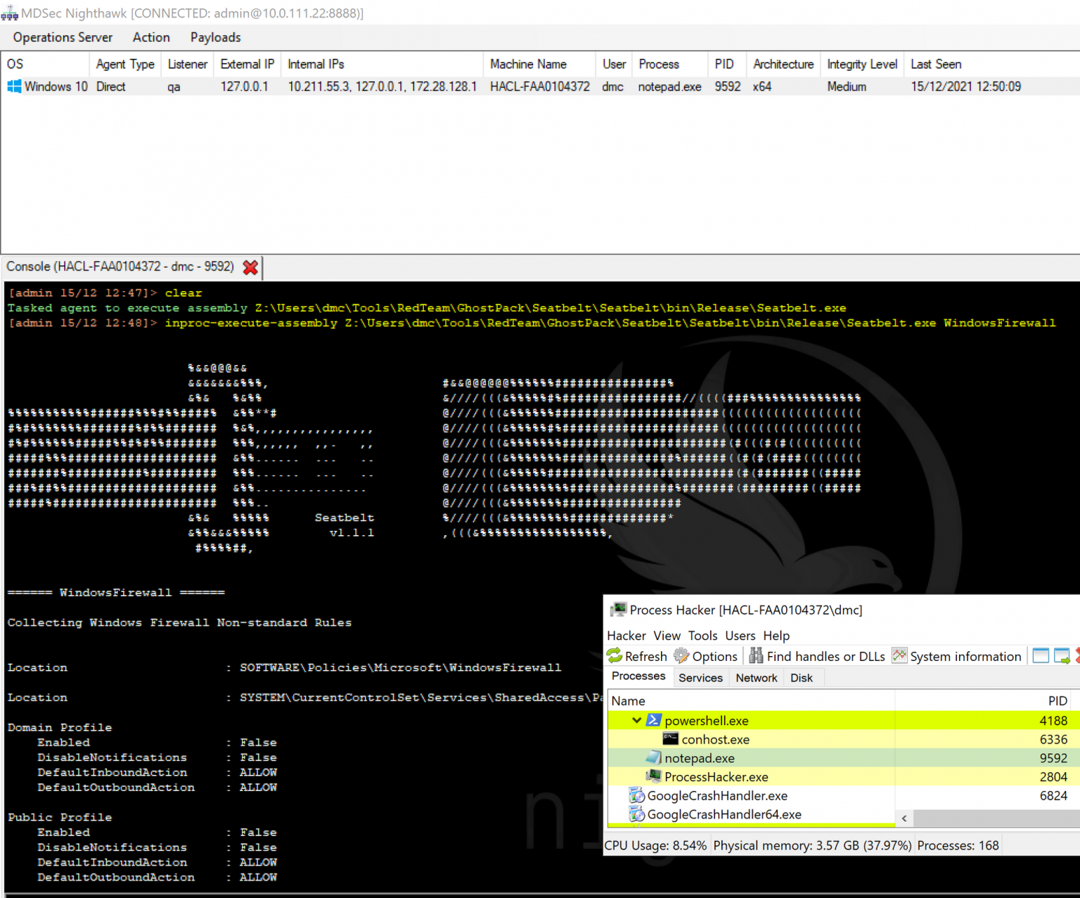 Nighthawk’s CLR harnesses avoid the nasty fork and run model, offering two modes of operation; in-process or remote process, where the latter allows you to inject an assembly in to an already running process (e.g. one that may already have the CLR loaded) and capture the output. In the injection scenario, it of course respects the aforementioned injector steps strategy and the use of syscalls where applicable.